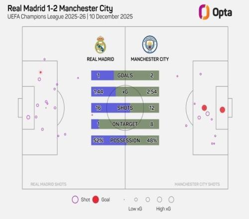 皇马1比2曼城,阿隆索的球队全场只有1脚射正,即罗德里戈的进球,这是自2003-04赛季以来,他们在伯纳乌球场进行的欧冠比赛中射正次数最少的一次。实际上,皇马全场16次射门比曼城多4次,但曼城一共有8次射正。本场赛前,皇马头号得分手姆巴佩手指骨折,尽管在最后时刻入选大名单,但全场比赛都只坐在替补席上。