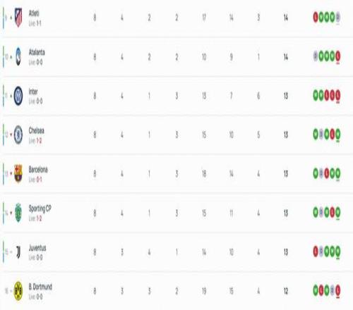 北京时间1月29日,欧冠联赛阶段最后一轮18场比赛全部结束了上半场的争夺。上半场结束后,曼城进入前八名,切尔西掉出前八名。西甲双雄皇马、巴萨目前都暂时落后,分别掉至第5和第13。